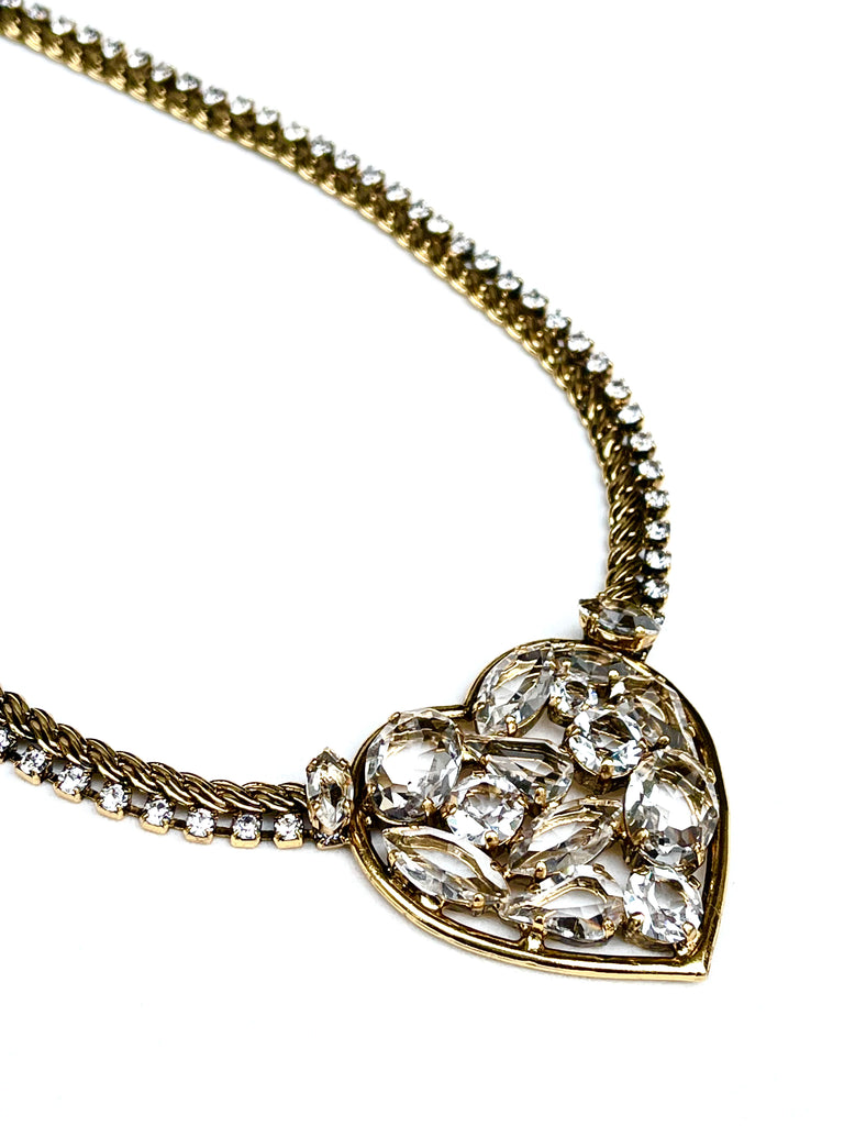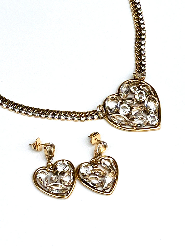 Collana con catena a maglia morbida oro antico e strass trasparenti , con un pendente a forma di cuore impreziosito da Swarovski trasparenti, e orecchino coordinato con gancio a chiodo.