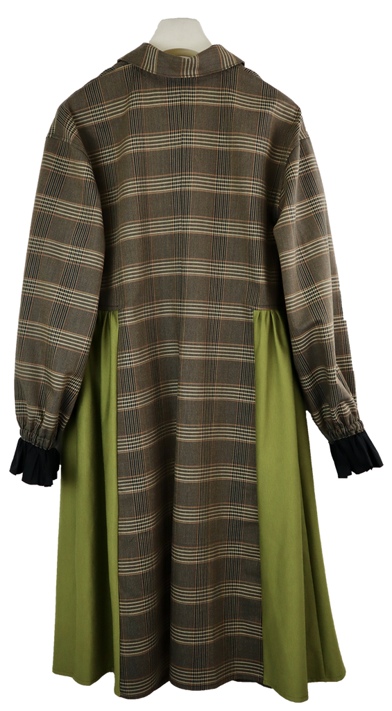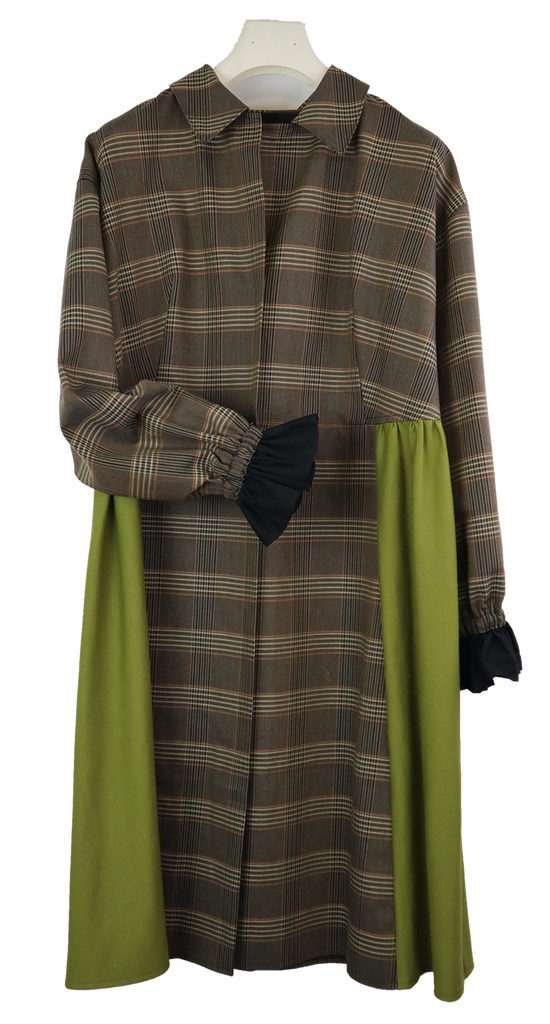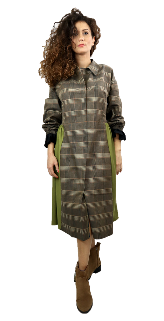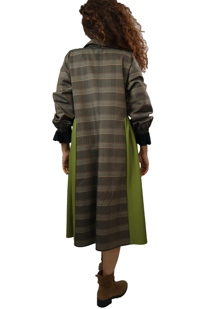 Abito molto versatile in principe di Galles con inserti laterali in morbida maglina arricchito con polsini in cotone arricciati.