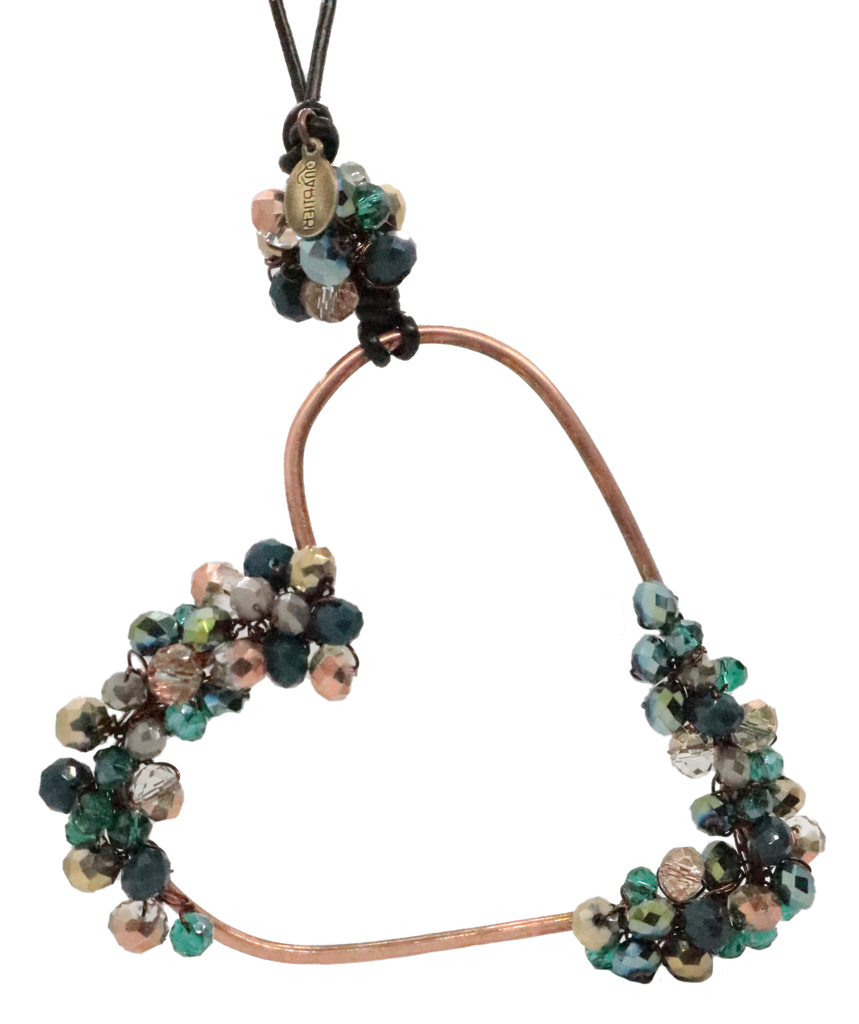 QUARTIERI collana realizzata con rame battuto a forma di cuore, impreziosito con cristalli e vetro di murano dai toni dell'azzurro, verde e rosa.