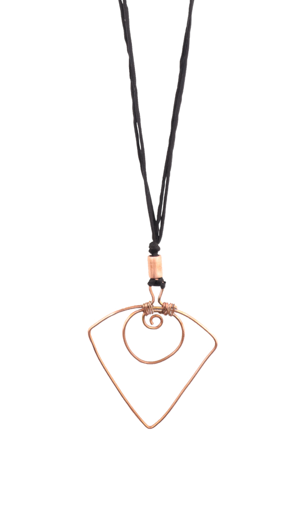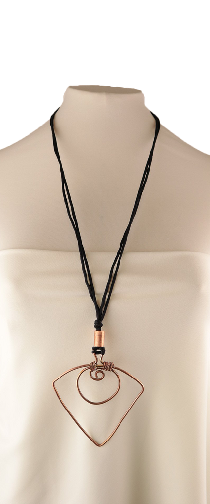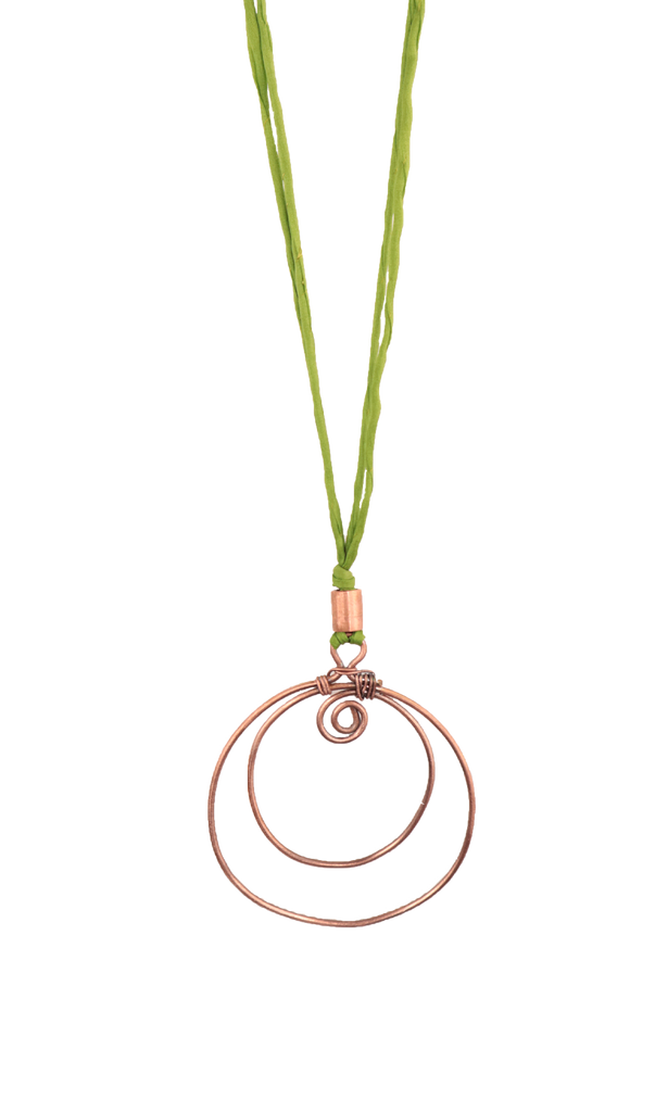 Collana pendente con filo di rame modellato in varie forme, sospese con filo di seta in tre colorazioni: rosso, nero e verde militare