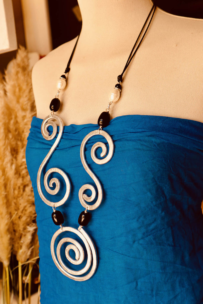 Collana Klimt lunga realizzata in alluminio battuto e spirali impreziosite da onice nero e perle di Maiorca