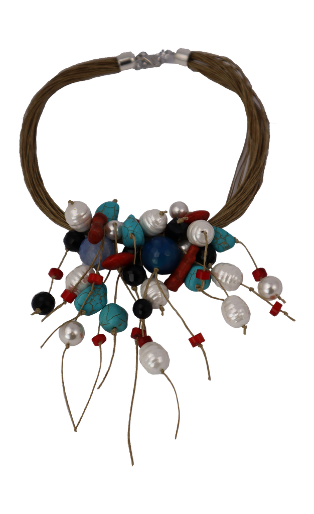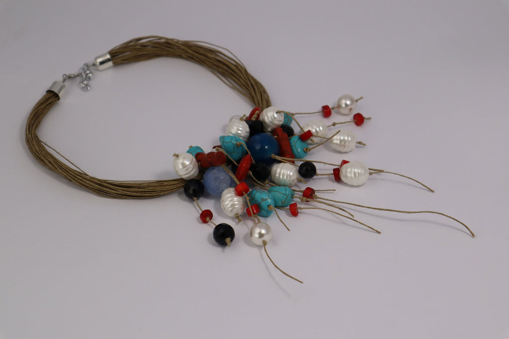Collana corta realizzata con lino grezzo e cascata di perle di Maiorca, agata nera, spugna di corallo e turchesi.