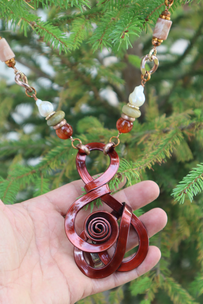 Collana lunghezza media, realizzata con pendente importante in piattina di rame smaltato, sospeso da quarzo, perle barocche, pietra di luna a cilindro, cristalli bronzati e catena ramata.