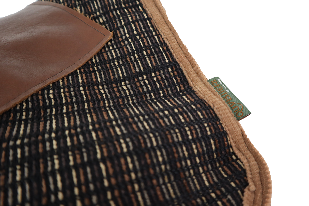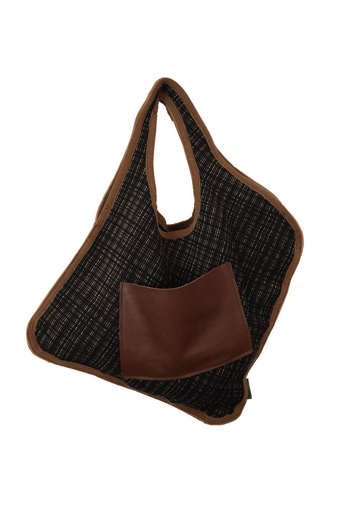 QUARTIERI Borsa in tessuto dai toni neri, cuoio e grigi, cucita a mano