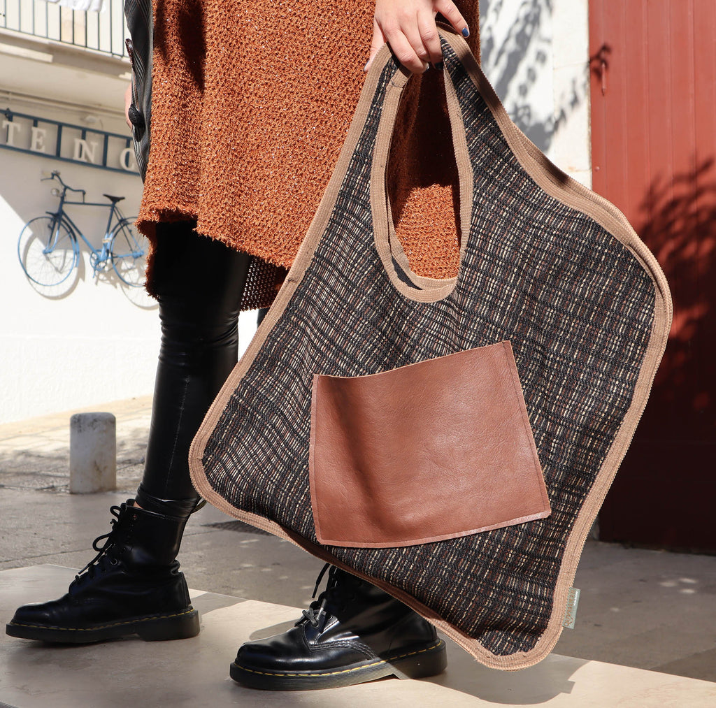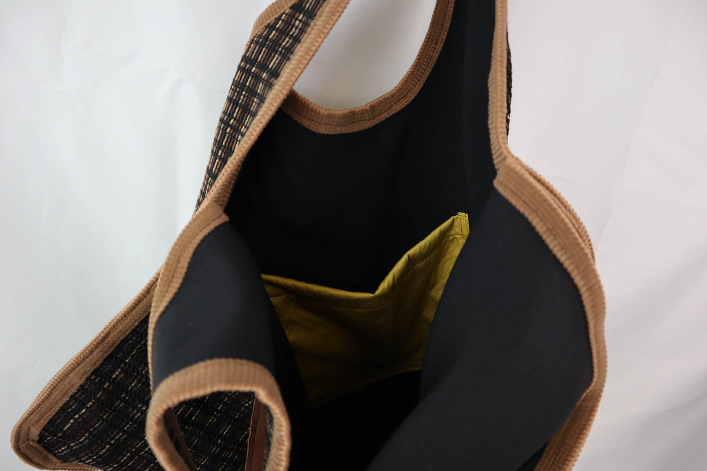 Borsa in tessuto dai toni neri, cuoio e grigi, cucita a mano con tasca esterna in pelle vera e tasca interna in tessuto giallo senape.