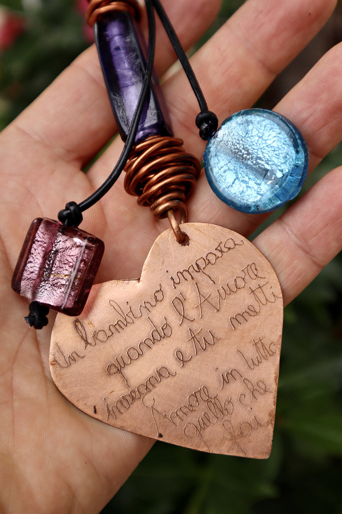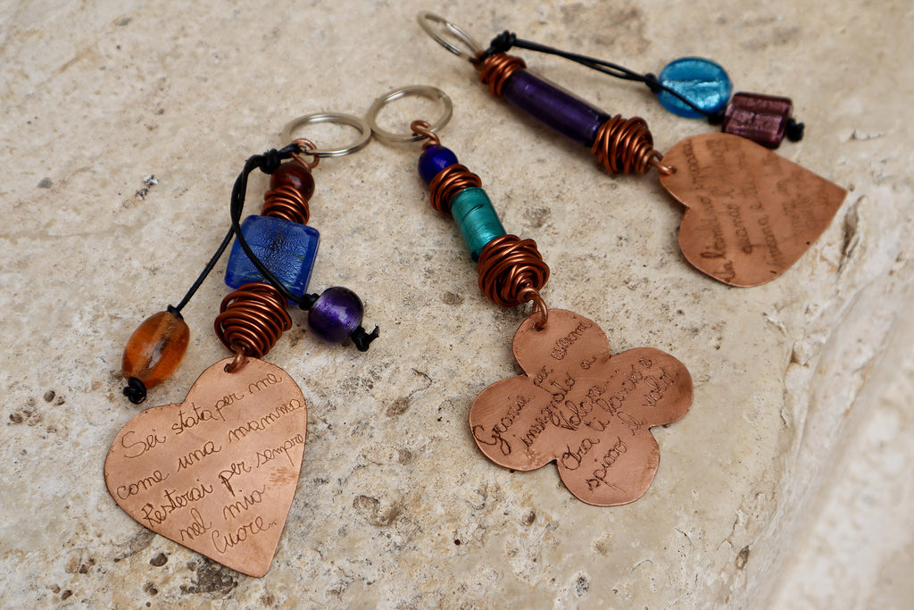Portachiavi realizzati con piastre in rame o alluminio, intramezzi di vetro di murano, pietre dure e legno a seconda delle richieste e frasi incise, con possibilità di personalizzazione.