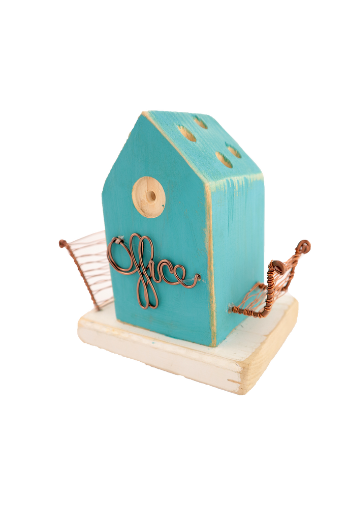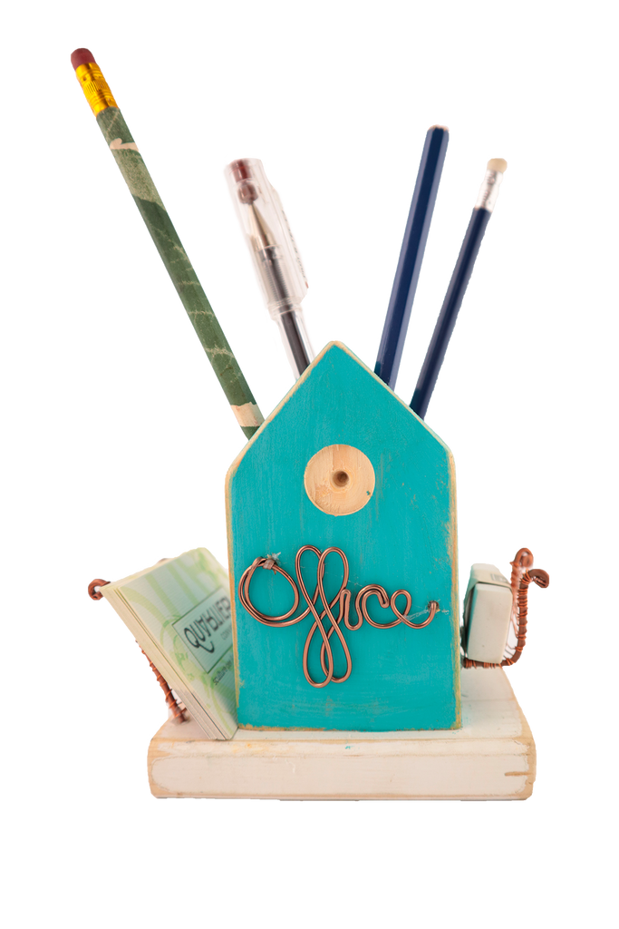 Casetta da scrivania realizzata in: legno colorato con tetto forato per portapenne, griglie laterali realizzate in filo di rame intrecciato per porta bigliettini da visita e gonna da cancellare.