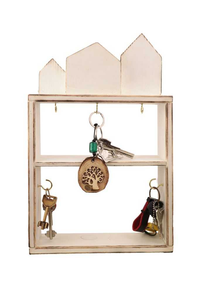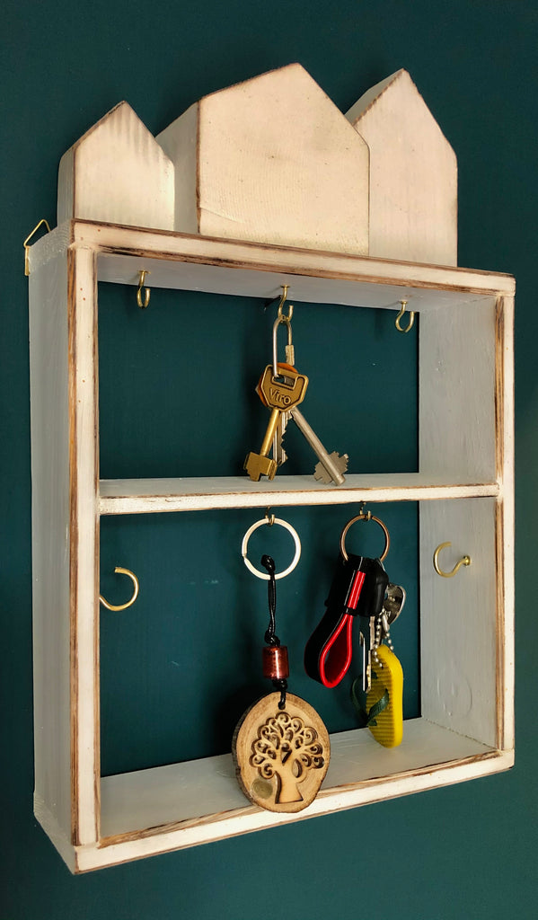 Cornice portachiavi da muro decorata con casette tridimensionali stilizzate di colore bianco realizzata in legno di abete decapato.