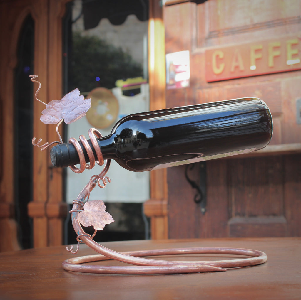 Portabottiglie realizzato con tubo di rame modellato a mano con volute e foglie.